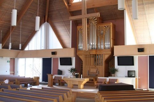 The Sanctuary is a beautiful building with the capacity to seat approximately 250 people. It has a “crying room” with full audio available. There is a full sound system, large flat-panel monitors in the front, and includes a hearing assistance loop. The beautiful 1500 pipe organ and large hanging cross highlight the front of the sanctuary. The décor is neutral and inviting, and large sliding glass doors and skylights allow natural light to cover the large space.